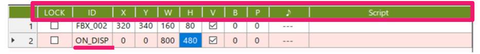 Properties include Object ID, X Coordinate, Y Coordinate, W Width, H Height, V Display, B Blinking, P You can specify the behavior of touch operation (long press / continuous), ♪ touch sound, and script.