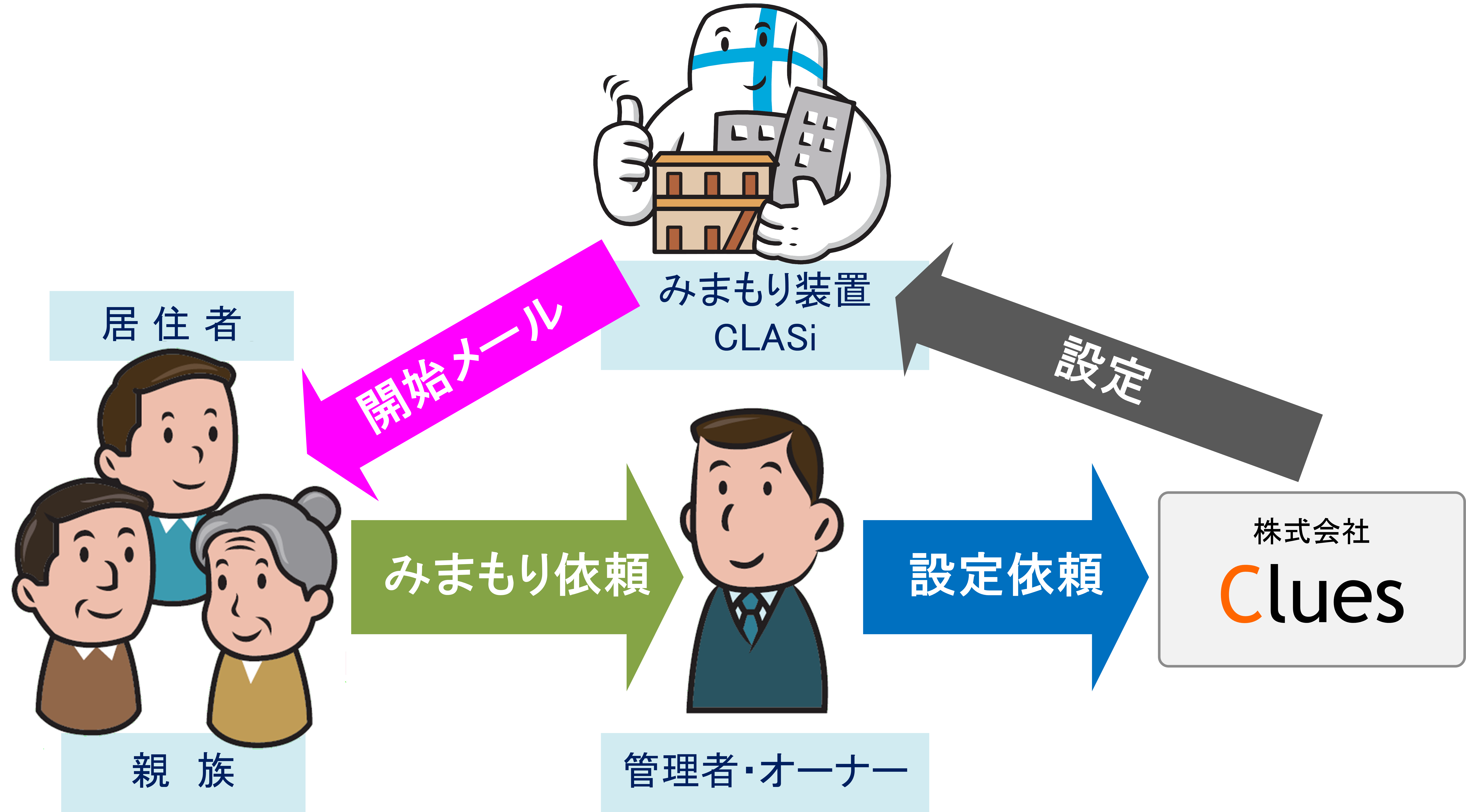 見守りを希望する居住者への設定は、弊社では居住者の本人確認が取れないため、オーナー・管理者を通じてご依頼を受け、設定します。